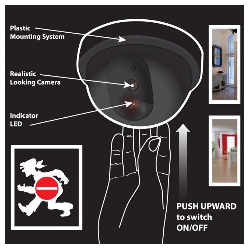 V zapnutom stave svieti červené LED, a to zabezpečuje dokonalú ilúziu nainštalovaného fungujúceho systému. Profesionálny kryt zabezpečuje realistický vzhľad kamery, a poskytuje kompletný pocit bezpečnosti. K prevádzke potrebujete 2 ks tužkových batérií typu AA, ktoré nie sú súčasťou balenia. V balenií nájdete aj skrutky, ktorými ju môžete jednoducho namontovať. K video systémom sa pripojiť nedá !