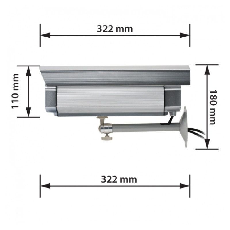V zapnutom stave svieti červené LED, a to zabezpečuje dokonalú ilúziu nainštalovaného fungujúceho systému. Profesionálny tvar a vzhľad zabezpečuje úplný dojem funkčnej bezpečnostnej kamery. Napájanie zabezpečujú 2 ks tužkových batérií rozmeru AA, ktoré nie sú súčasťou balenia. V balení nájdete hmoždinky a skrutky pomocou, ktorých kameru jednoducho upevníte na požadované miesto, nevyžaduje kabeláž. Nedá sa napojiť na bezpečnostný video systém! Vhodná pre použitie v interiéri ako aj exteriéri. Pri montáži v exteriéri s ohľadom na, čo najdlhšiu životnosť, dbajte na to, aby nebola priamo vystavená poveternostným vplyvom, vlhkosti a slnečnému žiareniu!