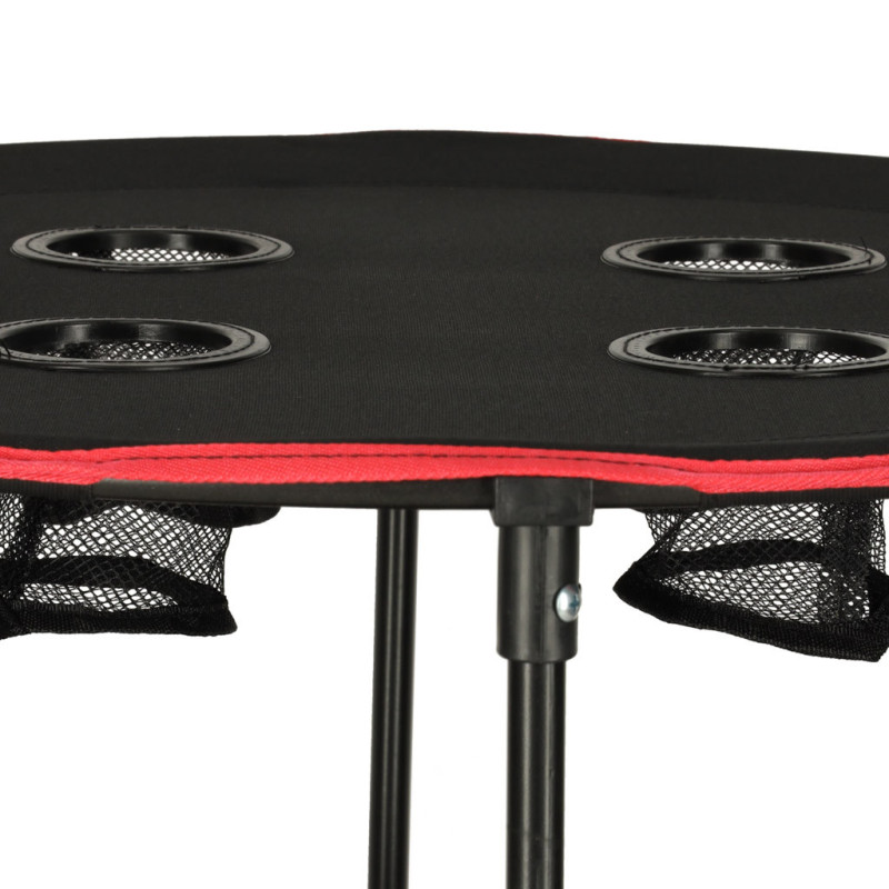 Stolík má pevný, ale pružný polyesterový vrch, ktorý je odolný voči poveternostným vplyvom. Integrované držiaky na nápoje chránia poháre či plechovky pred prevrhnutím. Konštrukcia stolíka je stabilná a má zámok proti nechcenému zloženiu, čo zvyšuje bezpečnosť používania, najmä pri deťoch.