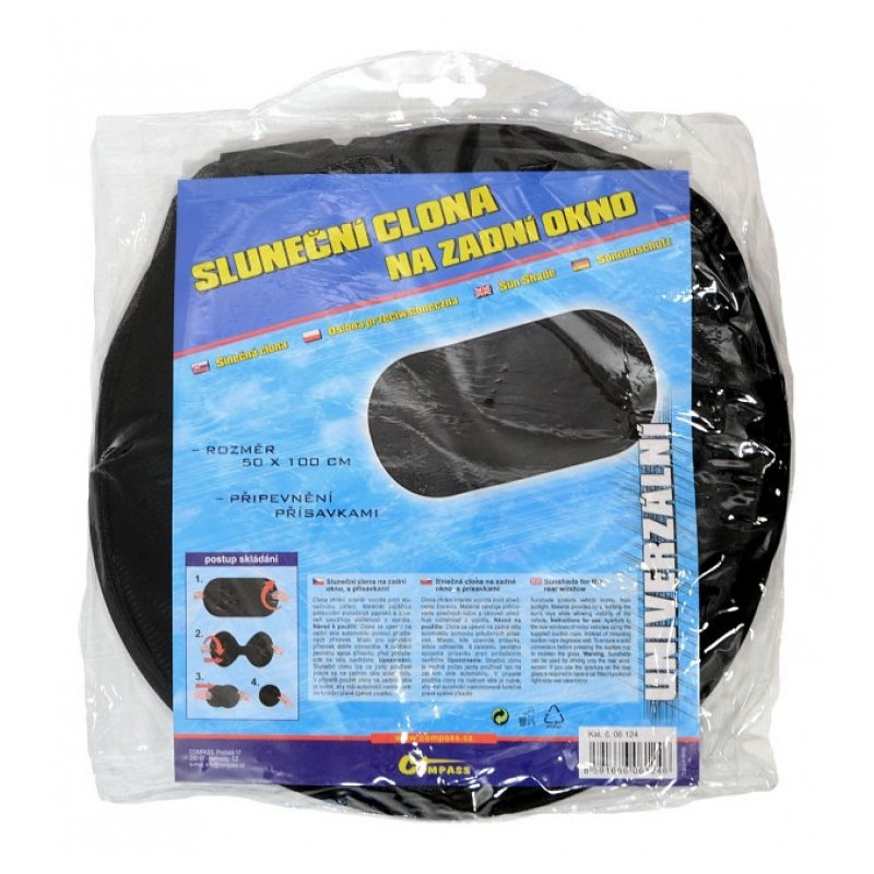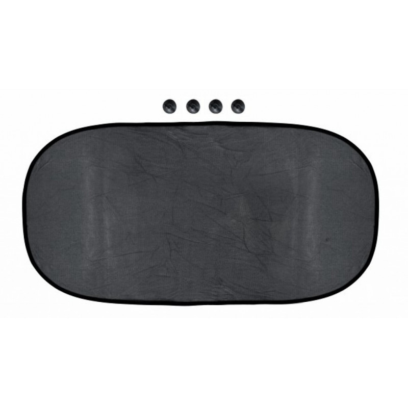 Slnečná clona s prísavkou na zadné okno automobilu. Spôsob perforácie materiálu zaisťuje absorpciu cca 70% slnečných lúčov. Po použití je možné clonu pohodlne zložiť späť do obalu. Farba čierna, tvar clony - ovál, bez potlače, veľkosť 50x100cm.