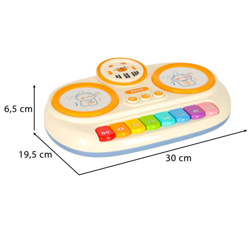 Veľké farebné klávesy sú ideálne pre malé prstíky, jemné podsvietenie motivuje k ďalšej hre. Pianínko učí súvislosť medzi pohybom a zvukom, čím podporuje koordináciu a manuálnu zručnosť. Okrem toho je vybavené okrúhlymi podložkami s jemným povrchom, ktoré po dotyku vydávajú bubnové zvuky – ideálne pre rytmické hranie.