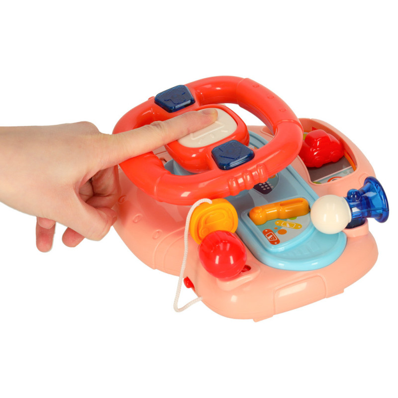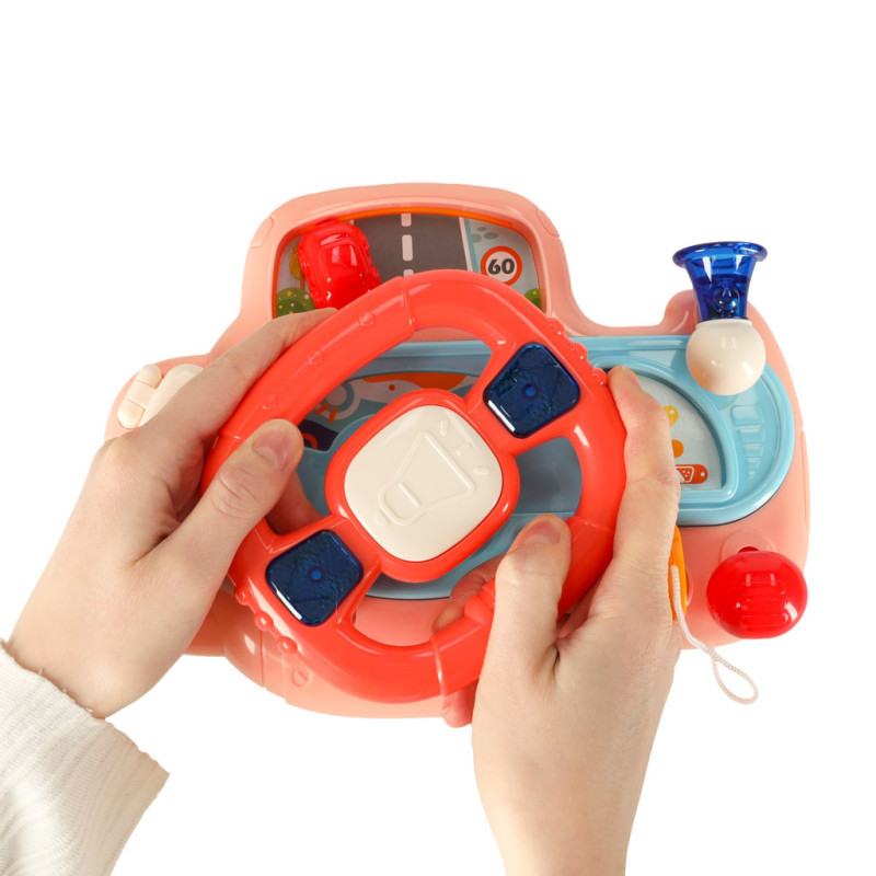 Dieťa môže pomocou volantu ovládať červené autíčko na palubnej doske a užívať si reálne zvuky štartovania motora, smeroviek či trúby. Hračka obsahuje 6 piesní a 6 melódií, ktoré robia hru ešte pestrejšou. Svietiace smerovky pridávajú na realistickosti a udržia pozornosť dieťaťa.
