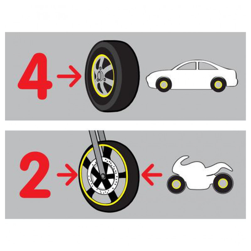 Miesto aplikácie dôkladne očistite a odmastite, prípadne aj alkoholom. Nedotýkajte sa lepidla prstami. postupne tlakom prikladajte jednotlivé časti na koleso. Neumývajte v priebehu 48 hodín. Vyhnite sa umývacím kefám.