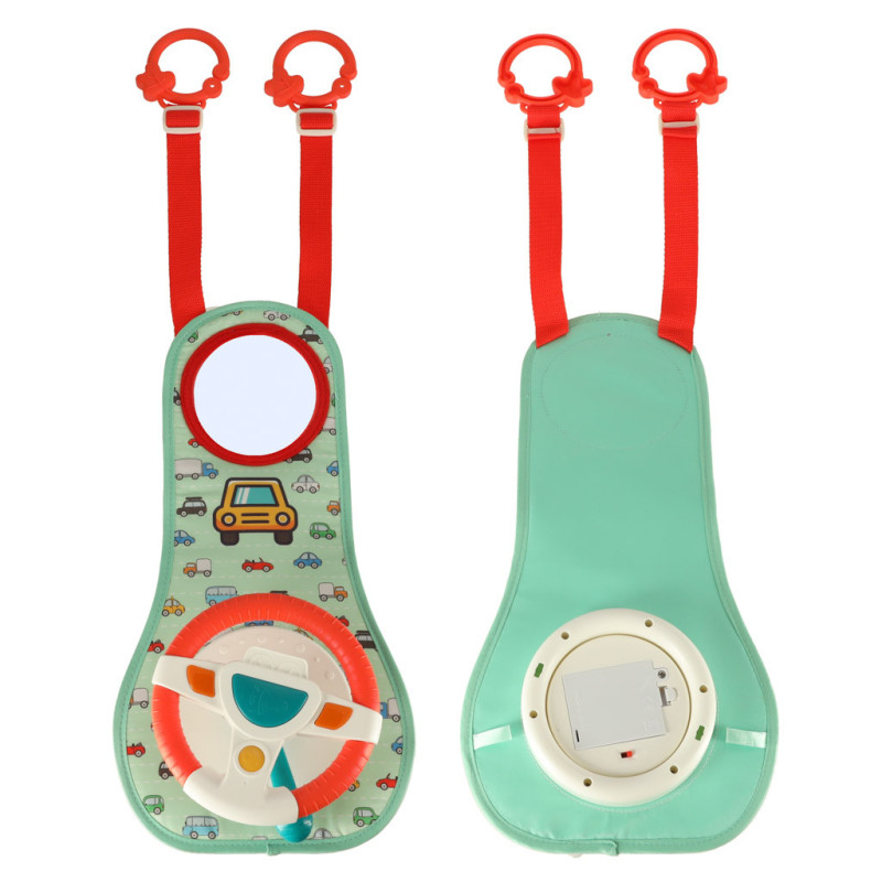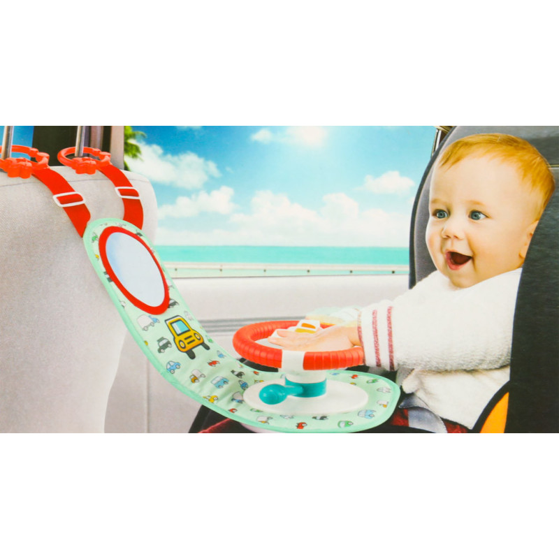 Hračku pripevníte k opierkam hlavy predného sedadla pomocou plastových koliesok na nastaviteľných popruhoch.