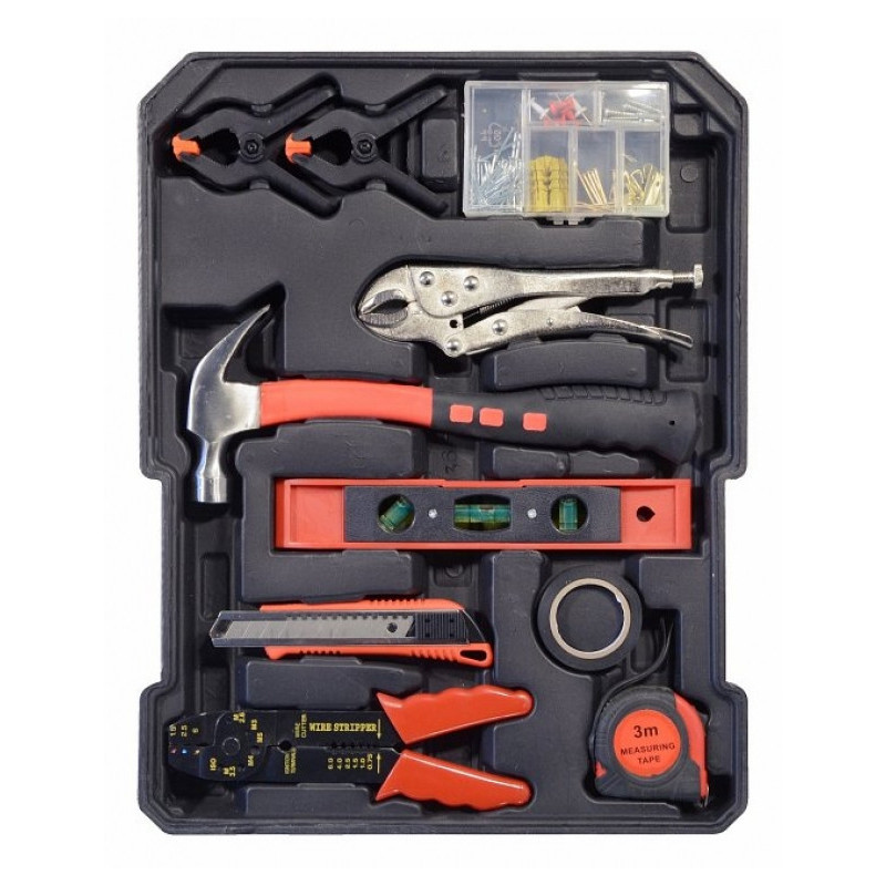 Praktický hliníkový kufor, 186 dielov kvalitného náradia, všetko usporiadané v prehľadných pozíciách - 4 nástrojová plata. Kufrík je vybavený teleskopickým úchytom a kolieskami, vďaka ktorým je manipulácia s celou sadou náradia veľmi jednoduchá. Sada obsahuje celý rad klieští, skrutkovačov, gola kľúčov, kladivo, vodováhu, stranové aj imbus kľúče, bity, základný spojovací materiál a celý rad ďalšieho náradia, ktoré je vhodné pre použitie ako doma, v garáži, tak aj na cestách. Rozmery kufra: 36 x 51 x 20 cm.