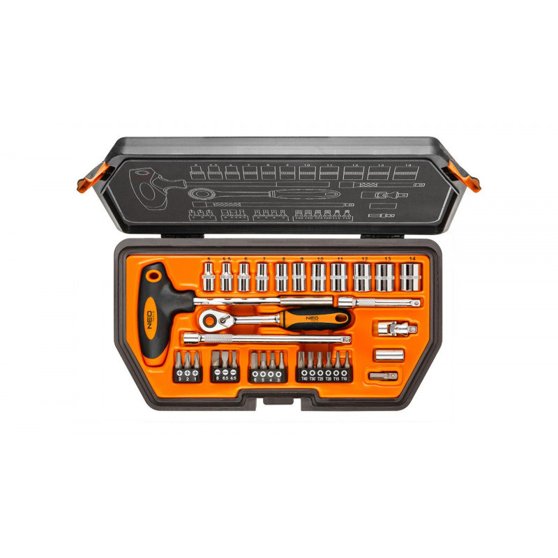 NEO Sada kľúčov 1/4 - 34 kusov z vysoko kvalitnej chróm-vanádiovej ocele. Sada obsahuje račňu vybavenú odolným račňovým mechanizmom (48 zubov), držiak na skrutkovač T, široký rad nástavcov (veľkosť 5 až 14 mm) a bitov z ocele S2 (plochý, krížový, šesťuholníkový, Torx odolný voči manipulácii). Dodávané v praktickom púzdre. Kvalita náradia potvrdená certifikátom TÜV a zárukou výrobcu na 25 rokov. Značka NEO spĺňa očakávania profesionálov.