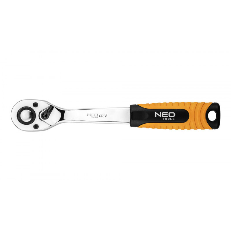 NEO 1/4 ' Račňa prepínacia s dĺžkou 145 mm . Vyrobená z chróm-vanádiovej ocele v súlade s DIN 3122. 72-zubový račňový mechanizmus zaručuje precíznu prácu. Je vyrobený z mimoriadne odolnej chróm-molybdénovej ocele, ktorá predlžuje životnosť náradia. Ergonomická rukoväť, vyrobená z dvoch materiálov, zvyšuje pohodlie pri práci. Kvalita náradia je potvrdená certifikátom TÜV a zárukou výrobcu na 25 rokov. Značka NEO spĺňa očakávania profesionálov.