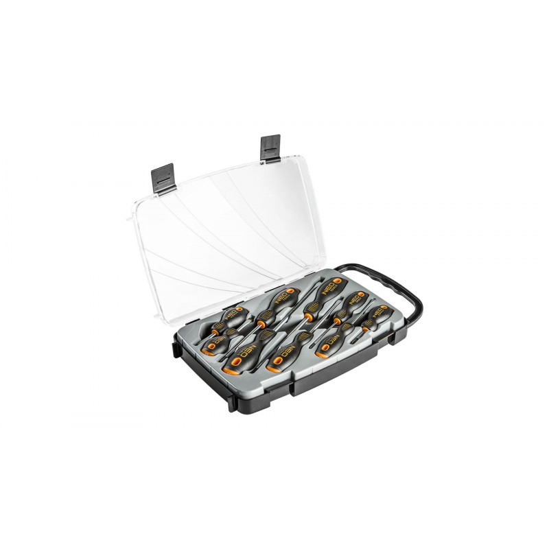 NEO Sada skrutkovačov obsahuje 9 skrutkovačov: ploché a krížové. Hrot skrutkovača je vyrobený z mimoriadne odolnej ocele S2. Čepeľ skrutkovača bola tepelne spracovaná, pre získanie vhodnej tvrdosti a odolnosti voči ohybu. Skrutkovač má magnetický hrot. Tvar trojramennej rukoväte s profilovanou opierkou na palec znižuje námahu pri práci a uľahčuje získanie správneho krútiaceho momentu. Protišmyková rukoväť vyrobená z dvoch materiálov je odolná voči chemikáliám, olejom a tukom. Kvalita nástroja je potvrdená zárukou výrobcu na 25 rokov. Značka NEO spĺňa očakávania profesionálov.