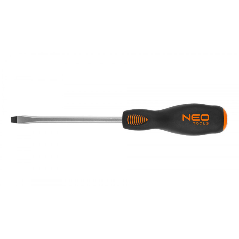 NEO Skrutkovač, plochý, sekací. Driek skrutkovača je vyrobený z mimoriadne odolného S2. Čepeľ skrutkovača je tepelne spracovaná, aby sa získala vhodná odolnosť voči ohybu a tvrdosť 56 HRC. Skrutkovač má magnetický hrot. Tvar trojramennej rukoväte s profilovanou opierkou na palec znižuje námahu pri práci a uľahčuje získanie správneho krútiaceho momentu. Rukoväť vyrobená z dvoch materiálov, protišmyková, odolná voči chemikáliám, olejom a tukom. Kvalita nástroja potvrdená certifikátom TÜV a zárukou výrobcu na 25 rokov. Značka NEO spĺňa očakávania profesionálov.
