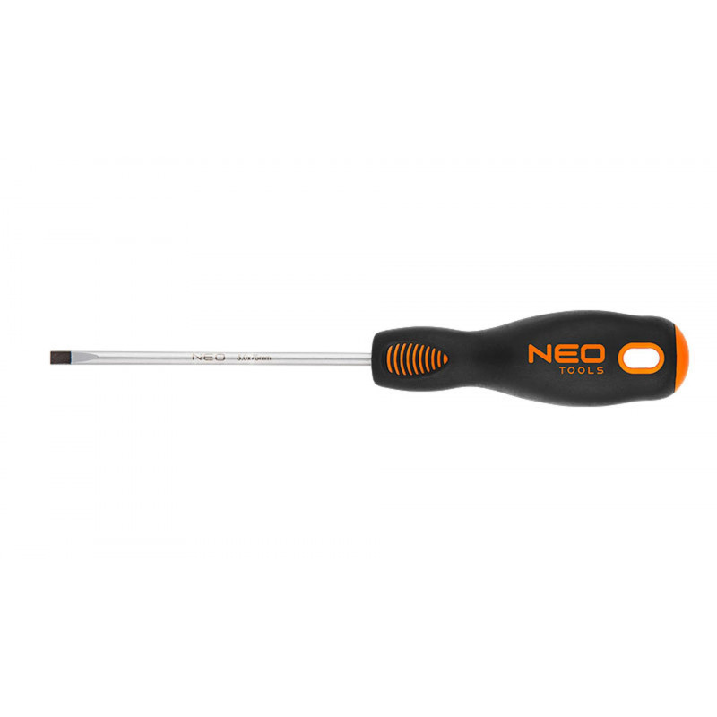 NEO Skrutkovač, plochý. Driek skrutkovača je vyrobený z mimoriadne odolného S2. Čepeľ skrutkovača je tepelne spracovaná, aby sa získala vhodná odolnosť voči ohybu a tvrdosť 56 HRC. Skrutkovač má magnetický hrot. Tvar trojramennej rukoväte s profilovanou opierkou na palec znižuje námahu pri práci a uľahčuje získanie správneho krútiaceho momentu. Rukoväť vyrobená z dvoch materiálov, protišmyková, odolná voči chemikáliám, olejom a tukom. Kvalita nástroja potvrdená certifikátom TÜV a zárukou výrobcu na 25 rokov. Značka NEO spĺňa očakávania profesionálov.