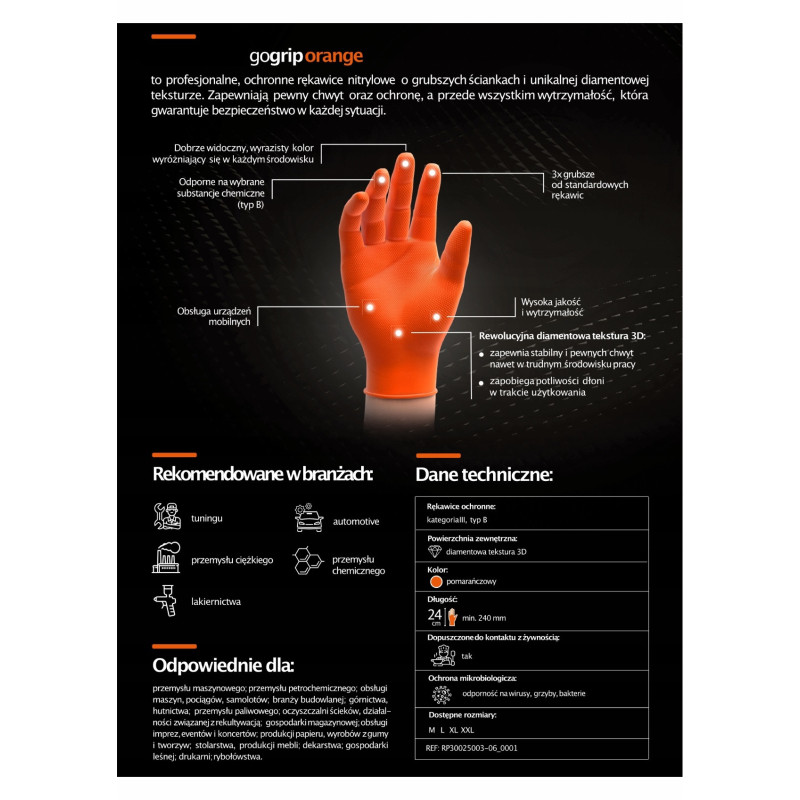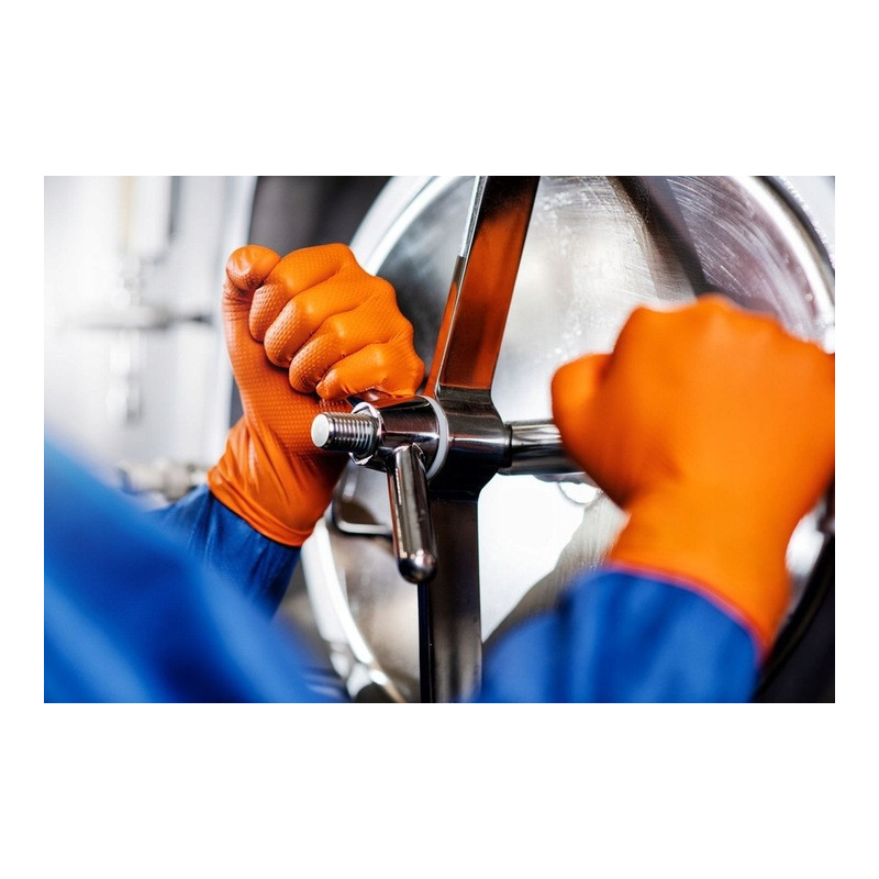 Nitrilové rukavice GoGrip oranžové veľkosti M, 50 ks sú kvalitné jednorazové rukavice vyrobené z odolného nitrilu, ideálne pre náročné pracovné podmienky. S trojnásobnou hrúbkou oproti štandardným rukaviciam a 3D diamantovou textúrou poskytujú vynikajúci úchop aj v mastnom alebo vlhkom prostredí. Tieto rukavice neobsahujú latex, sú bez púdru a spĺňajú normy EN ISO 374-1, EN ISO 374-2, EN ISO 374-4, EN ISO 374-5, EN ISO 16523-1 a EN ISO 21420 pre vysokú ochranu proti chemikáliám a mikroorganizmom.