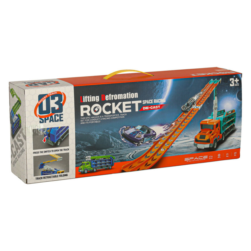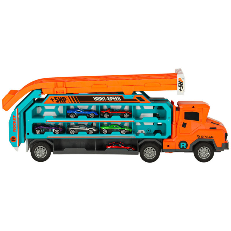 Oranžovo-modrý nákladný príves, ktorý sa premieňa na pretekársku dráhu, je skvelou hračkou pre malých nadšencov áut. Kamión s rozmermi 50 x 10 x 18 cm prepravuje 6 malých autíčok. Po rozložení sa mení na dvojprúdovú dráhu vysokú 57 cm, ideálnu na usporiadanie napínavých pretekov. Hračka podporuje rozvoj jemnej motoriky a koordinácie oko-ruka u detí.