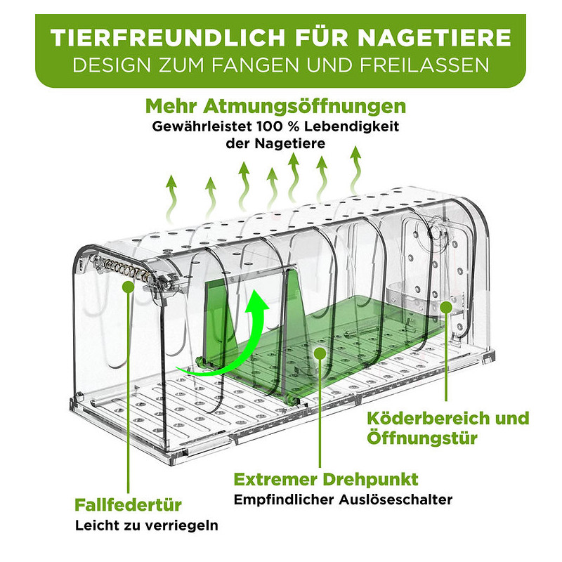 5) Keď myš vstúpi, spustí pedál, aby sa zatvorili predné dvere. Vzduchové otvory okolo pasce zabraňujú uduseniu myši.