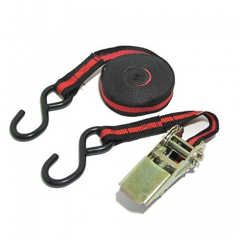 Upínací popruh s kovovou račňou a dvoma kovovými hákmi, dĺžka 5 m, šírka 25 mm.