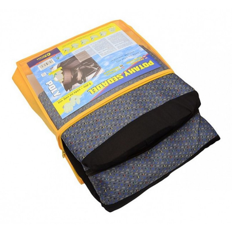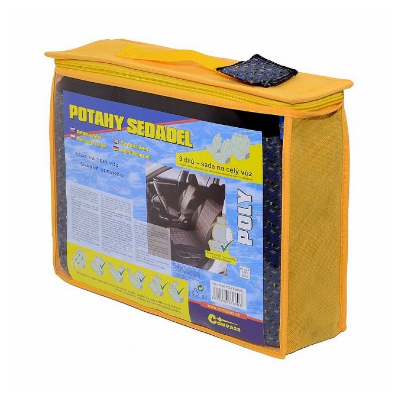 Poťahy sedadiel POLY, sada na celý automobil. Možno pripevniť na väčšinu bežne používaných automobilových sedadiel. Poťah možno použiť na sedadlách, ktoré majú zabudovaný bočný airbag priamo v operadle predných sedadiel. Balenie obsahuje poťah na predné sedadlo (2x), zadný sedák (celý), zadné operadlo (pomocou zipsu deliteľné na 3 diely), opierku hlavy (5x). Vďaka zipsom na zadnej operadlovej časti je možné poťahy použiť aj na vozidlá s delenými zadnými sedadlami a operadla sklápať bez nutnosti sňatí poťahu.