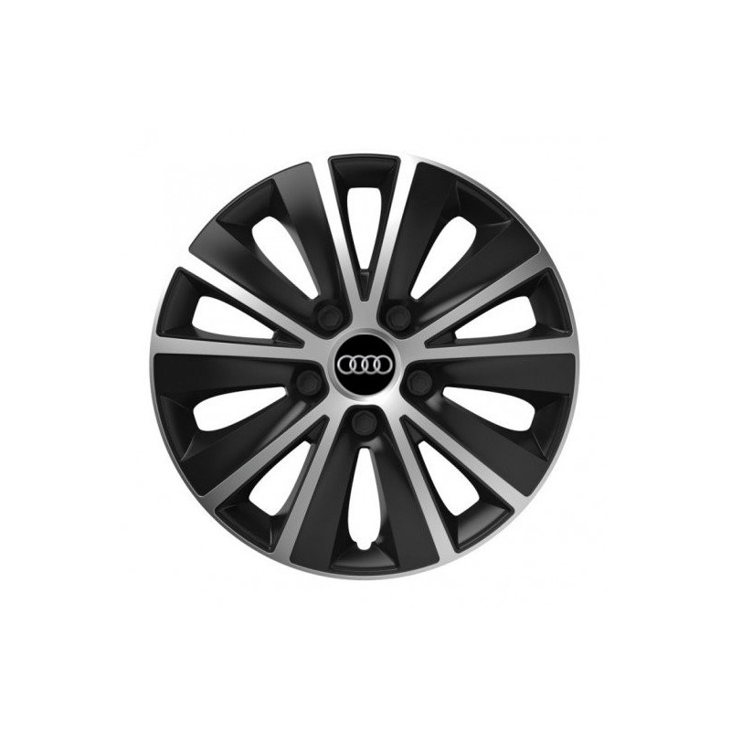 Puklice 14 RAPIDE silver and black pre Audi na ocelové disky. Pre kolesá o veľkosti R14 so živicovými samolepkami Audi.Príjemca :