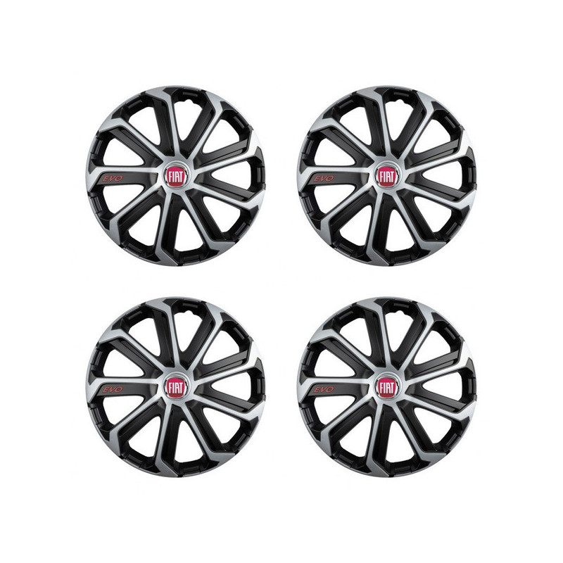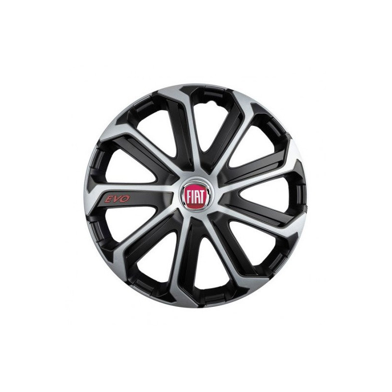 Puklice 14 Evo black&silver pre Fiat (červené) na ocelové disky. Pre kolesá o veľkosti R14 so živicovými samolepkami Fiat (červené).Príjemca :