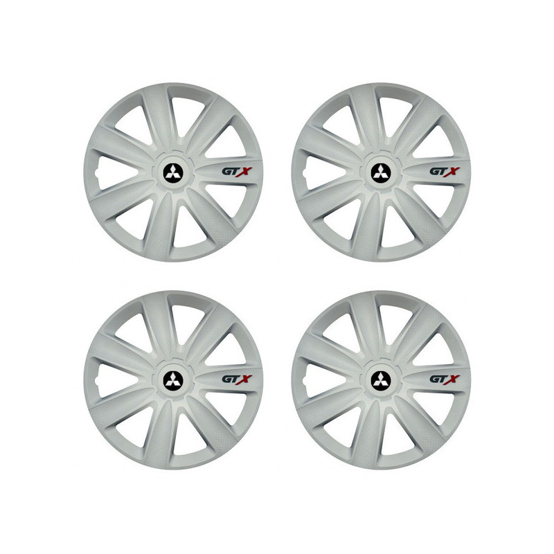 Puklice 14 GTX carbon white pre Mitsubishi (strieborné) na ocelové disky. Pre kolesá o veľkosti R14 so živicovými samolepkami Mitsubishi (strieborné).Príjemca :