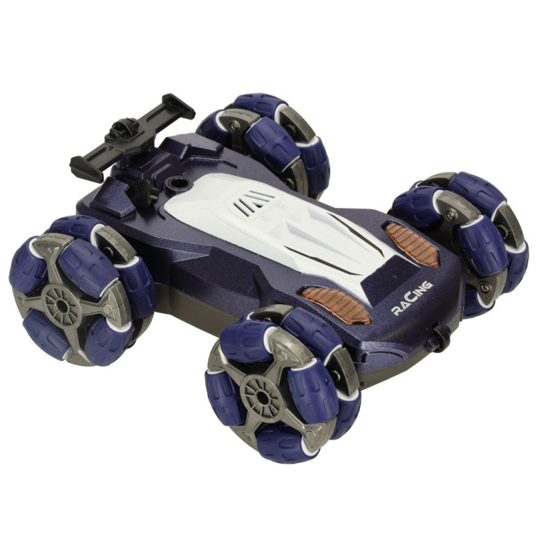 Malé, modré a zábavné RC auto je ideálnou hračkou pre každého malého nadšenca diaľkovo ovládaných modelov. Okrem originálneho dizajnu zaujme aj dvojitým systémom ovládania – klasickým ovládačom pre presné manévrovanie a inovatívnym ovládačom na ruku, ktorý umožňuje ovládanie pomocou gest. Svetelné efekty a dym vychádzajúci z výfuku dodávajú hre ešte väčší realizmus a zábavu. Auto sa pohybuje všetkými smermi a zvládne tak každú výzvu na trati. Napája sa pomocou dobíjateľného akumulátora, ovládače sú na batérie (nie sú súčasťou balenia).