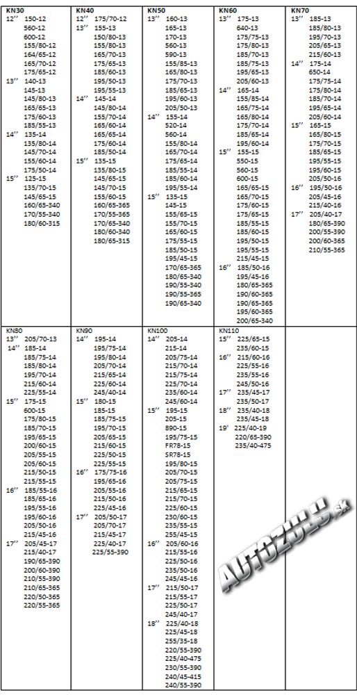 2. Nájdite rozmer pneumatík a zvoľte rozmer reťazí (napr. ak máte 195/55R15 teda 195 je šírka pneumatiky, 55 je bočný profil, 15" je priemer pneumatiky: Zvolíte reťaze KN60)