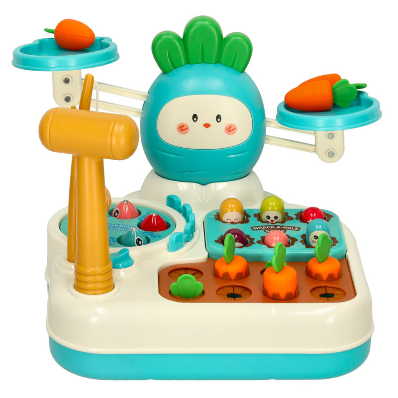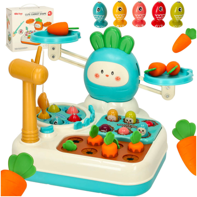 Farebné komponenty, ako sú rybky, mrkvy a krtkovia, robia hru atraktívnou a podnecujú zvedavosť dieťaťa. Vďaka priloženej udici, kladivku a váhe bude každá hra iná a zábavná.