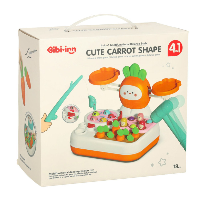 Interaktívna hračka v tvare mrkvy je zábavný a všestranný set, ktorý ponúka až štyri rôzne hry podporujúce logické myslenie, obratnosť a koordináciu. Deti si môžu zahrať na rybárov, zberačov mrkiev, triafať krtkov a vyvažovať váhu s farebnými prvkami.