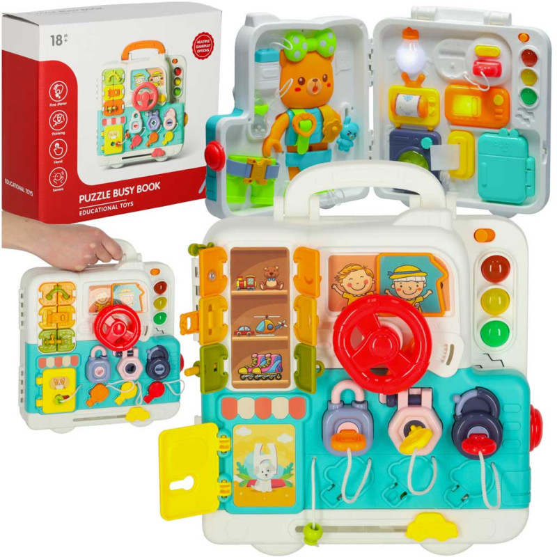 Senzorická manipulačná tabuľa montessori montessori kľučky medvedík XXL svetlo zvuk. Vek: 18m+