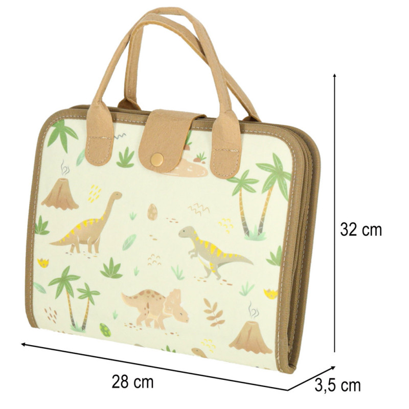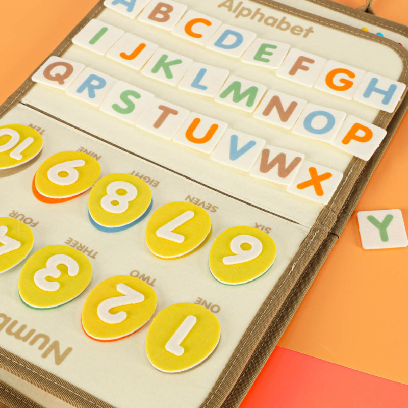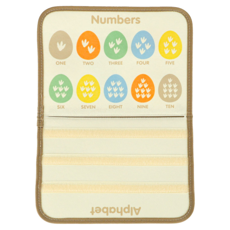 Tabuľa obsahuje farebné filcové prvky, čísla, písmená a dinosaury, ktoré motivujú dieťa objavovať a učiť sa. Deti si osvoja písanie, počítanie, rozpoznávanie tvarov a farieb, a dokonca aj prvé anglické slovíčka vďaka tematickému obsahu.