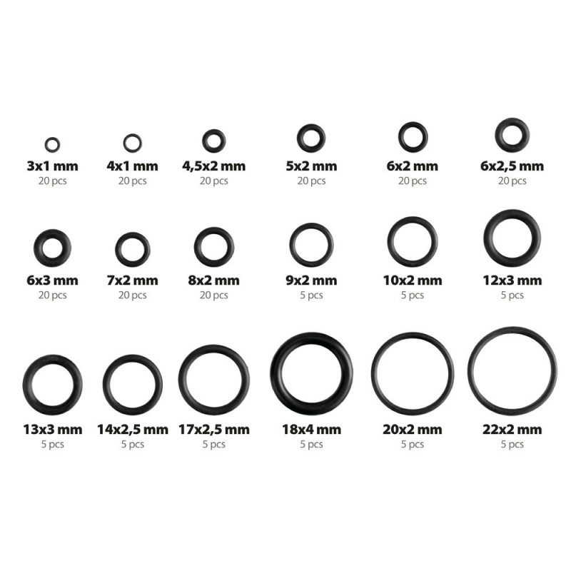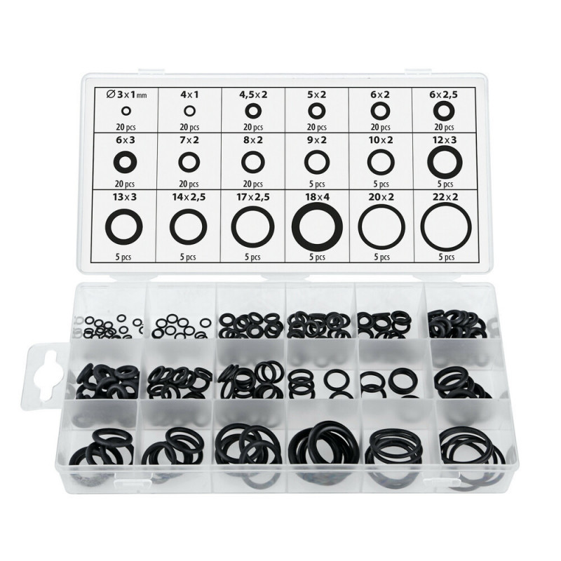 Tesniace krúžky, 225 ks, 18 veľkostí Vyrobené z NBR 20 ks: Ø 3 x 1 mm 20 ks: Ø 4 x 1 mm 20 ks: Ø 4,5 x 2 mm 20 ks: Ø 5 x 2 mm 20 ks: Ø 6 x 2 mm 20 ks: Ø 6 x ...