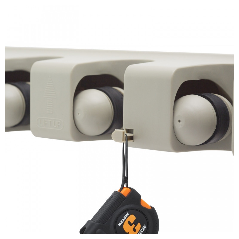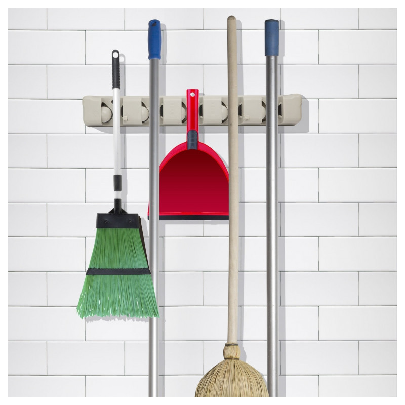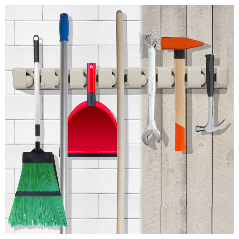 Držiak výrazne ušetrí miesto pri uložení upratovacích pomôcok alebo náradia. Vhodný do interiéru aj exteriéru. 5 úchytných miest pre akýkoľvek nástroj (priemer rukoväte 1,5-max.3,5 cm). Rukovať automaticky zapadne na miesto. 3 skrutkami uchytiteľný na stenu (sú v balení).