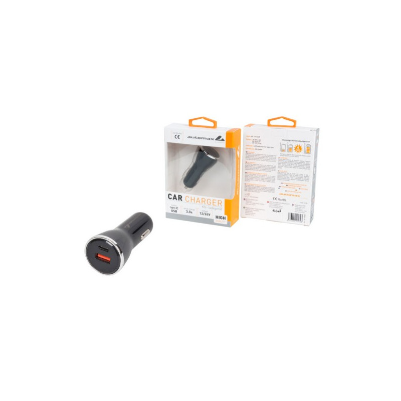 Nabíjací adaptér (nabíjačka) s USB C a USB A konektorom pre použitie v automobile. Vhodná pre nabíjanie mobilných telefónov a akýchkoľvek zariadení, ktoré používajú ako zdroj USB port. Vstup 12V-24V. Výstup z nabíjačky DC 5V - 3.0A, DC 9V - 2.0A, DC 12V - 1.5A.