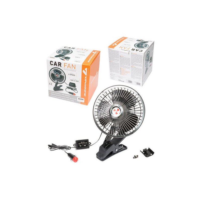 Ventilátor do auta 12V s dvomi rýchlosťami FAST/SLOW vhodný pre vozidlá bez klimatizácie, prípadne pre vozidlá kde výkon klimatizácie nie je dostačujúci, použiteľný na Vami vybranom mieste kde je ho možné pripojiť pomocou zásuvky zapalovača.