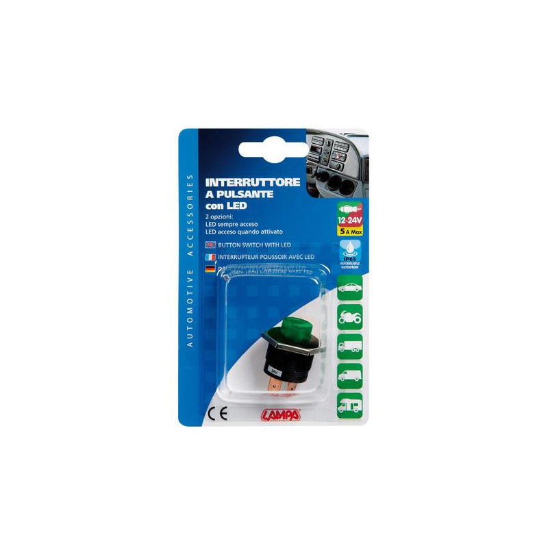 Vypínač tlačítkový s LED indikátorom, zelený, 12/24 V Charakteristika produktu: Materiál: tvrdený plast Farba tlačidla: zelená 5 A Rozmer: 6,3 x 0,8 mm