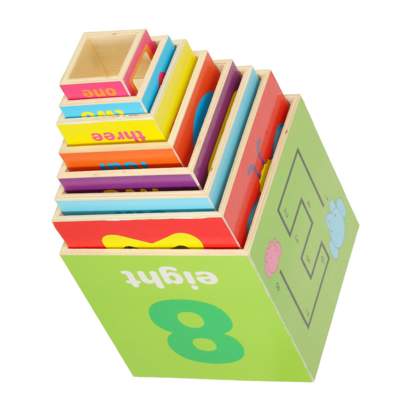 - 8 drevených farebných kociek s narastajúcimi rozmermi (od 4,6 x 4,6 cm do 14 x 14 cm)