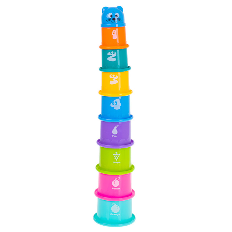 Stavění věže z kelímků posiluje manuální zručnost, koordinaci oko-ruka a logické myšlení. Na každém kelímku se nachází číslo, ovoce a zvířátko s otvory na dně, díky kterým je možné hračku využít i při koupání – nalijte vodu a sledujte, jak vytéká!