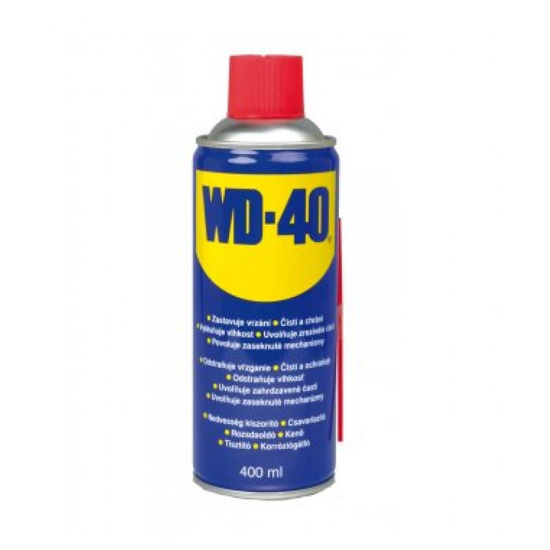 Univerzálne mazivo WD-40 čistí, chráni, vytesňuje vlhkosť, zastavuje vŕzganie, uvoľňuje zhrdzavené časti a povoľuje zaseknuté mechanizmy.
