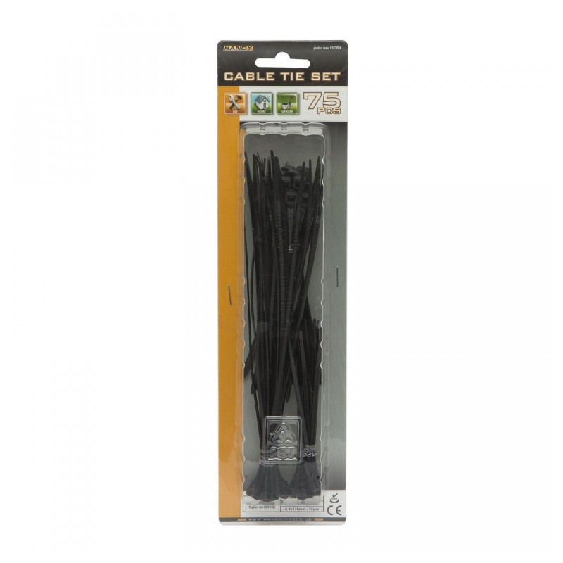 Materiál: Nylon 66 (94V.2) Typ: sťahovací Rozmery - počet - farba: 2.5 x 100mm - 25 ks - čierna 4.5 x 120mm - 25 ks - čierna 2.5 x 200mm - 25 ks - čierna